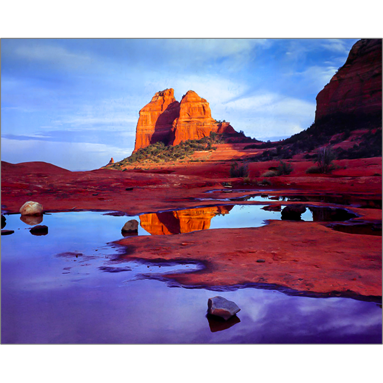 In only a few minutes one can drive and be outside the city limits of Sedona. To get to this view one has to drive an unmaintained dirt road for several miles, hike through shrubs and over red rocks to an area that, during rain storms, fill with water and create wonderful reflections. Since the best time is very early in the morning and the road is very difficult to maneuver, Lou DeSerio left his house at 4:30am to be in position to catch the sunrise on the red rocks of Schnebly Hill, with very rich reflections in the shaded pools. After going up every day for a week, he eventually found the water was deep enough, the clouds were in position and the sunrise just right to capture this very rare moment.